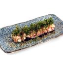 Enroladinhos de salmão maçaricado, salmão empanado, cream cheese, azeite trufado, molho tarê e couve crocante.