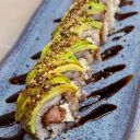 Camarão empanado e cream cheese. Envolto em abacate, molho tarê e gergelim.